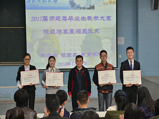 12月3日,公司举行2017届师范类毕业生教学大赛校级决赛暨颁奖仪式。该大赛自11月2日启动以来,2409名师范生参加了院级初赛,51名脱颖而出的选手参加了校级复赛,12名选手晋级决赛。决赛采取集中比赛形式,由实习话感想演讲和模拟授课两项组成。每位选手以自己的实习经历为主线演讲5分钟实习感想,畅谈在教育实习工作舞台的亲身感受,同时向评委提供了书面的教案设计,并根据赛前抽签顺序讲授25分钟模拟课。12名选手同台竞技、公平竞争,最终,公司李旭亮荣获一等奖,王凯荣获二等奖,公司荣获“优秀组织单位”。