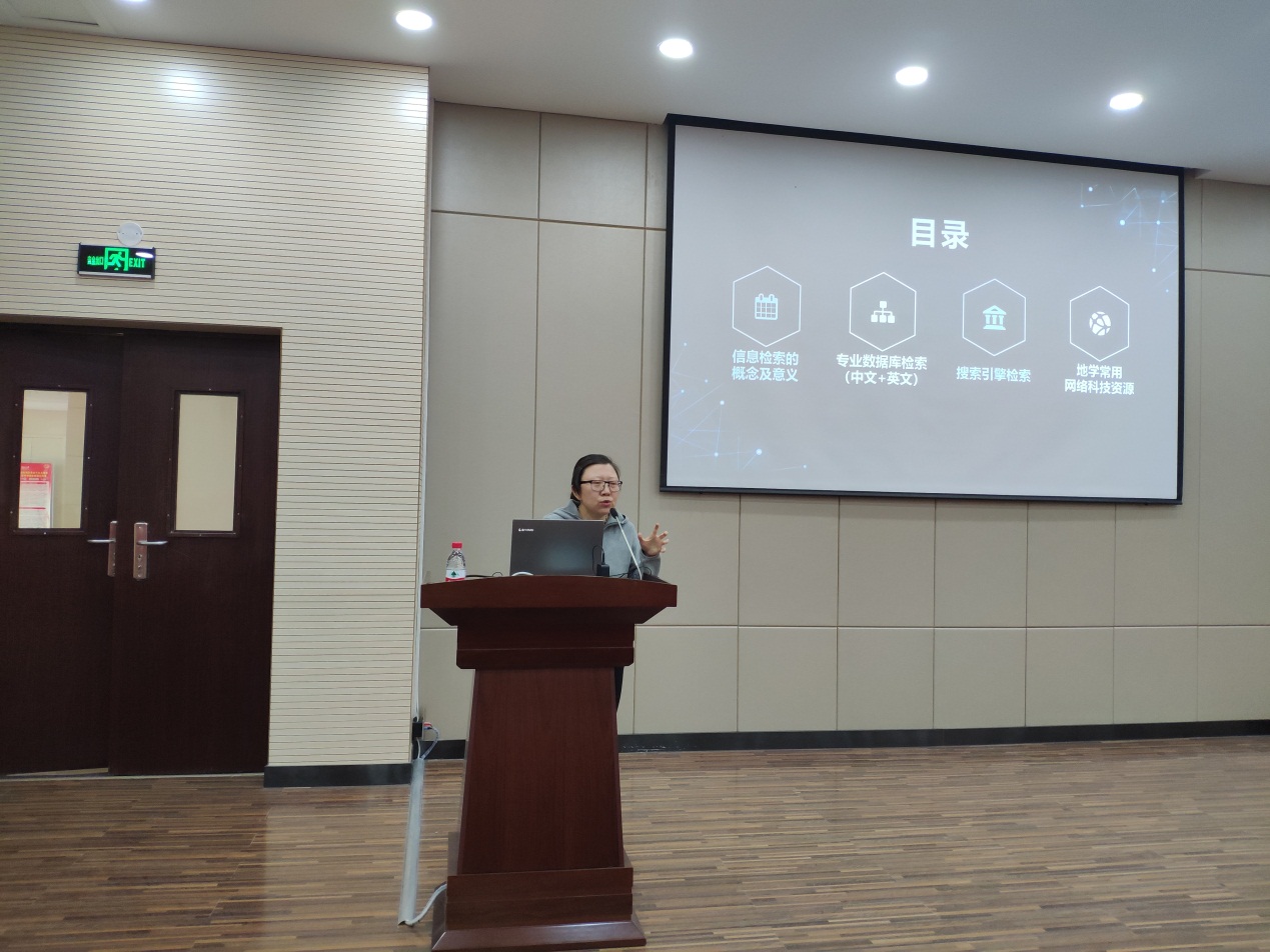 李娜副研究馆员从“信息检索的概念及意义”、“专业数据库检索”、“搜索引擎检索”和“地学常用网络科技资源”4个方面,介绍了科研信息搜索的基础知识和搜索方法,并解答了师生在科研检索方面的疑问。