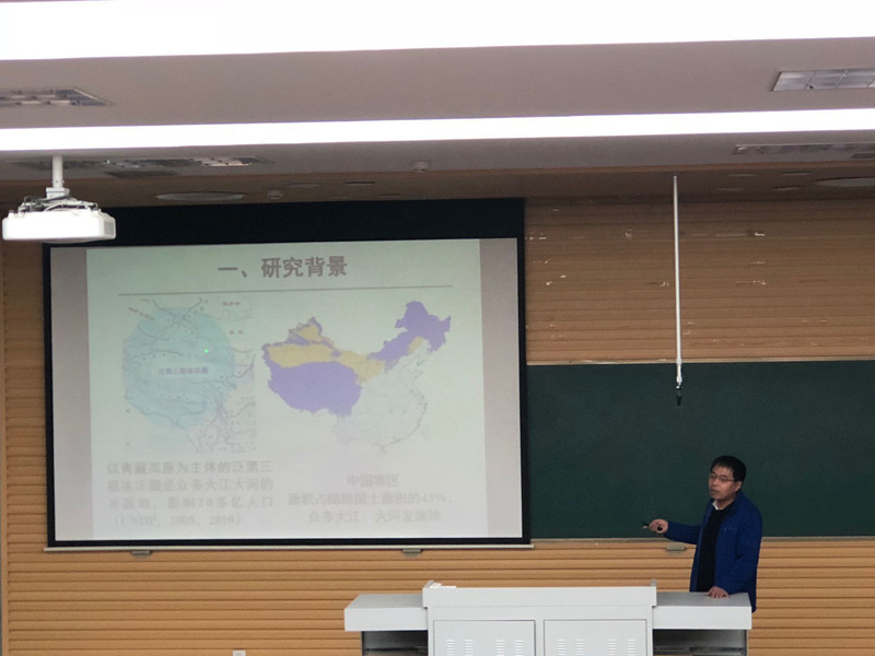 陈仁升研究员围绕“中国寒区径流”这一主题,详细介绍了黑河上游站建设进程和在葫芦沟流域开展的野外综合观测实验仪器布设情况,并对祁连山区最大降水高度、观测误差校正、固液态分离、降尺度方法、冰冻圈流域水文模型研制、黑河径流估算及预估、中国寒区径流变化等方面的最新研究成果做了系统讲解。报告结束后,与会师生与陈仁升研究员进行了热烈深入的探讨和交流。
