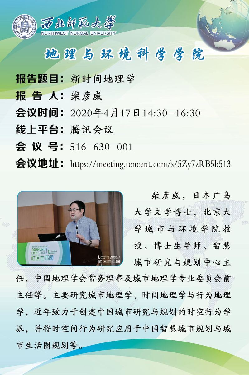 应公司邀请,北京大学柴彦威教授将于2020年4月17日(14:30—16:30)在腾讯会议平台(会议号:516630001)做学术报告,报告题目为“新时间地理学”,欢迎老师和同学们积极参加。