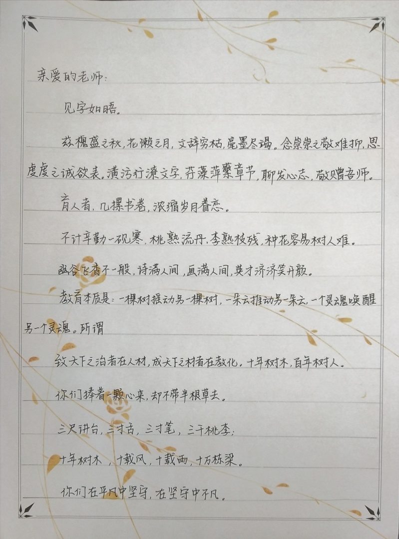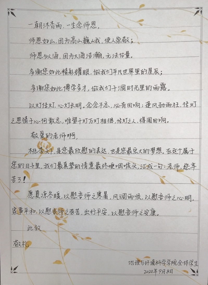 教师节来临之际,公司员工手写书信一封,诚祝各位老师教师节快乐!