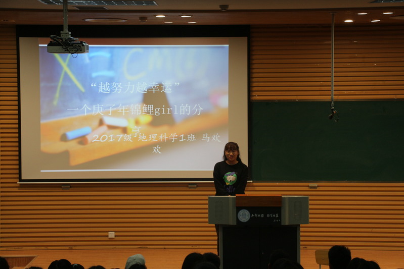 首先,由保送至兰州大学的马欢欢同学为同学们介绍学习经验。她通过自身经历,建议大一新生在大学期间积极主动地参加科研项目和专业比赛,并鼓励同学们在完成自己学业的同时,多参加自己感兴趣的活动来全面提升自身能力。