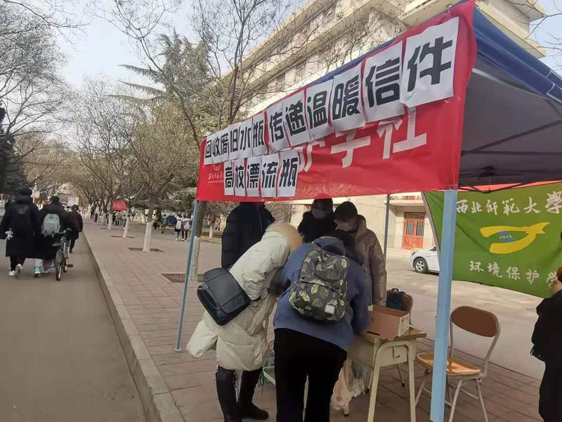 活动与兰州其他高校联合举办,以回收废旧水瓶,传递温暖信件为主题,主要回收在校园中产生的废旧水瓶,并以废旧水瓶为媒介,交换同学们的信件。漂流瓶分为三种:定向瓶、分享瓶、交友瓶,以满足不同员工的需求,拉进同学们的情感距离,宣传废弃物回收利用的理念,树立环保意识,在寒冬中传递温暖力量,受到同学们的一致好评。