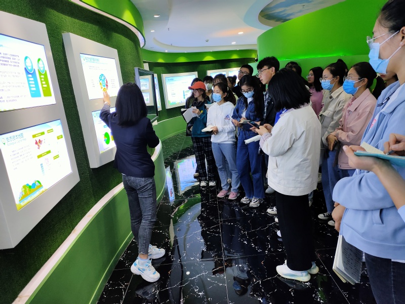 研学过程中,中心老师在一楼的生态环境科普基地讲到:随着我国经济发展方式向绿色低碳转型,生态环境保护领域的人才重要性、紧缺性日益显现。十三届全国人大四次会议通过的《中华人民共和国国民经济和社会发展第十四个五年规划和2035年远景目标纲要》明确提出,到2035年,我国将形成广泛的绿色生产生活方式,碳排放达到峰值并开始稳中有降,生态环境根本好转,美丽中国建设目标基本实现……随后,中心老师围绕如何进行碳排放核算、什么是生态资源资本化等专业问题进行解答,并就同学们的就业兴趣展开互动讨论。
