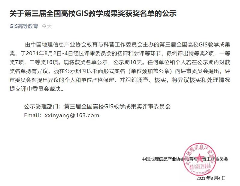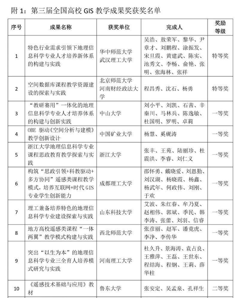 全国高校GIS教学成果奖由中国地理信息产业协会教育与科普工作委员会、教育部高等公司地理科学类专业教学指导委员会共同设立,每两年评选一次,旨在奖励在我国高校地理信息教学实践、改革、研究中取得优秀教学成果的单位和个人。
