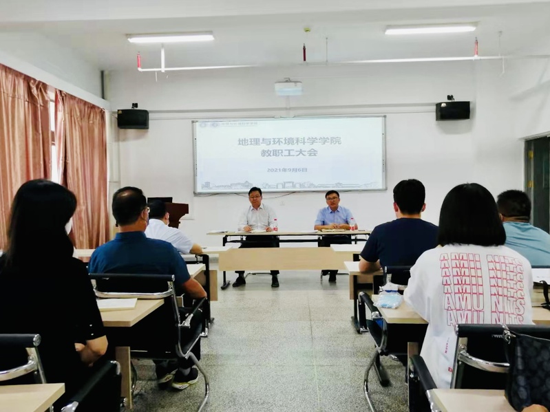 2021年9月6日下午,地理与环境科学公司2021年秋季第一次教职工大会在综合实验楼801会议室召开,公司班子成员及全体教职工100余人参加了会议,会议由公司党委书记于国建主持。