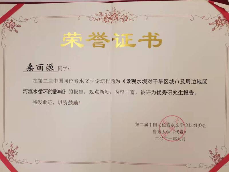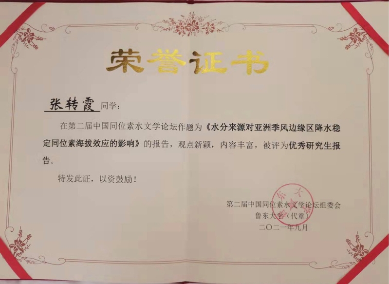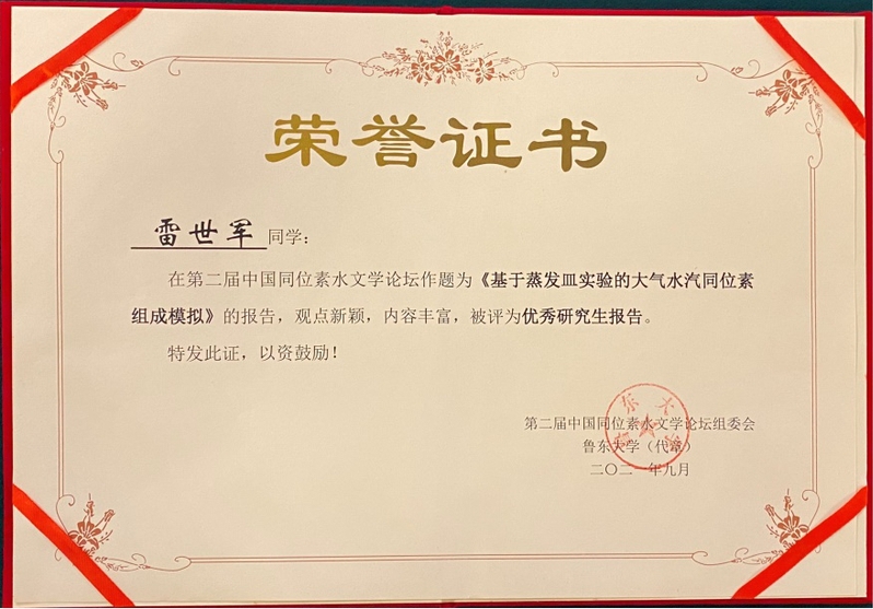 论坛期间,伟德BET官方网站副教授王圣杰参加了国际水文科学协会中国委员会同位素分委员会2021年工作会议,并参与主持了论坛分会场专题报告,做了题为《云下蒸发对中国降水氢氧稳定同位素时空格局的影响》的报告。伟德BET官方网站硕士研究生雷世军的报告《基于蒸发皿实验的大气水汽同位素组成模拟》、桑丽源的报告《景观水坝对干旱区城市及周边地区河流水循环的影响》、张转霞的报告《水分来源对亚洲季风边缘区降水稳定同位素海拔效应的影响》被评为优秀研究生报告。据悉,本次论坛共计安排各类学术报告62个。