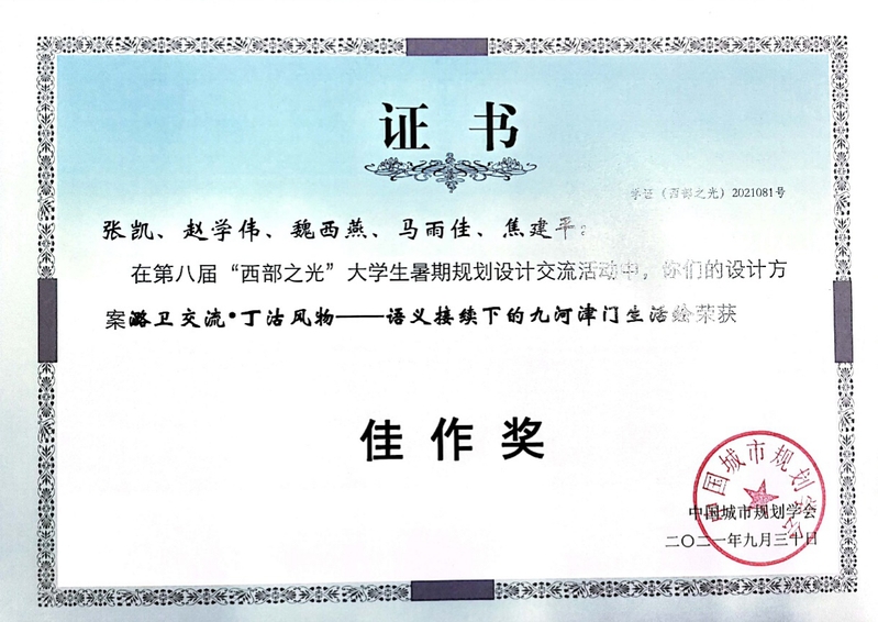 2021年9月10日第八届“西部之光”竞赛获奖名单发布,本次竞赛主题为:“激活三岔口·重塑天津卫”——天津市三岔河口周边老城提升改造规划设计。来自重庆大学、西北大学、长安大学、贵州大学、西安建筑科技大学等40多所高校、146份设计作品参与角逐,经过专家评审,最终22份作品获奖。由公司李巍、张志斌、杨建秀老师带队参加、指导的设计作品获佳作奖,这是继公司员工持续参与高水平规划竞赛所获的又一佳绩。参赛作品:张凯、赵学伟、魏西燕、马雨佳、焦建平五位同学提交的作品《潞卫交流·丁沽风物——语义接续下的津门九河生活绘》(指导教师:李巍、张志斌、杨建秀);漆建武、王宗相、尤旭斌、张开勇、齐振旭五位同学提交的作品《里映外河·无界之境——“时空装置”编制的大运河三岔河口段记忆再生设计》(指导教师:李巍、张志斌、杨建秀)。“西部之光”老员工规划设计竞赛由中国城市规划学会、全国高等公司城乡规划学科专业指导委员会主办,是专门针对西部地区提升规划教育水平的需求,选择真实项目(地块),由西部地区的高校组织本校规划专业研究生和高年级员工进行规划设计的实践竞赛。