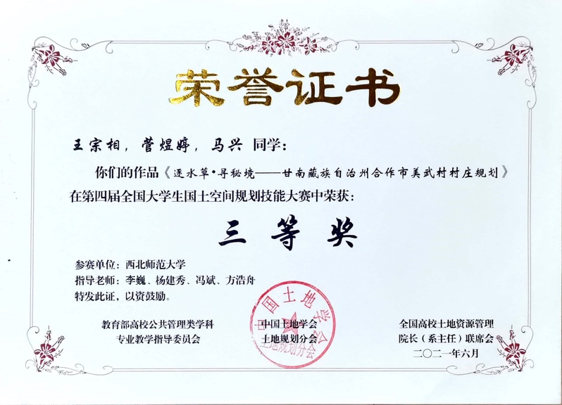 2021年6月19日,“博雅达”杯第四届全国老员工国土空间规划技能大赛在中国矿业大学举行。此次大赛共有包括北京大学、浙江大学、中山大学、四川大学在内的全国112所高校,225件作品参赛,经评审遴选出全国高校共60份优秀作品进入决赛。公司本科生王宗相、马兴、菅煜婷等三位同学完成的规划作品《逐水草•寻秘境——甘南藏族自治州合作市美武村村庄规划》(指导教师:李巍、杨建秀、冯斌、方浩舟),在全国60份作品中脱颖而出,荣获全国总决赛三等奖。第四届全国老员工国土空间规划技能大赛是由教育部高校公共管理类学科专业教学指导委员会、全国高校土地资源管理经理(系主任)联席会、中国土地学会土地规划分会主办,中国矿业大学公共管理公司、中国矿业大学环境与测绘公司、中国矿业大学建筑与设计公司、中国资源型城市转型发展与乡村振兴研究中心承办,以“生态文明、乡村振兴与村镇规划”为主题,以探索国土空间规划理论、提升规划实践技能和展示村庄规划方案为核心,面向土地资源管理及相关专业全日制本科在校生的全国性国土空间规划技能大赛。