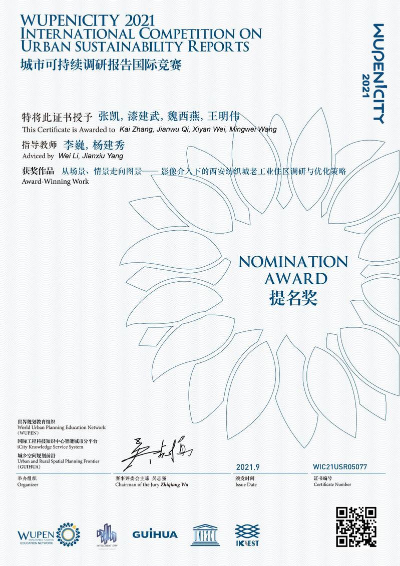 2021年9月21日在世界规划教育组织WUPEN(World Urban Planning Education Network)主办的2021年度城市设计及可持续调研报告竞赛结果发布,公司学子积极参加、表现出色,由张凯、漆建武、魏西燕、王明伟四位同学提交的作品《从场景、情景走向图景—— 影像介入下的西安纺织城老工业住区调研与优化策略》(指导教师:李巍、杨建秀)获得提名奖。本次大赛共有来自同济大学、清华大学、北京大学等国内知名高校在内的近百所高等院校学子参加角逐。WUPENiCity城市设计及可持续调研报告竞赛由世界规划教育组织(World Urban Planning Education Network)、联合国教科文组织iCity网站(UNESCO-iCity Website)、Guihua Journal杂志联合举办的国际赛事,面向国际所有设置城市规划与城市设计相关专业的高等院校发布,以促进国际间规划教育和员工的开放交流。该项赛事目前是国内城乡规划专业级别最高、最权威的竞赛之一。