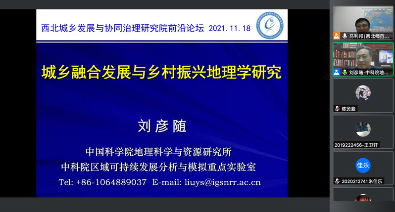 2021年11月18日,由BET伟德官方网站西北城乡发展与协同治理研究院、伟德BET官方网站联合举办的“第二届西北城乡发展与协同治理研究院2021年前沿论坛”第三场学术报告在线开讲。发展中国家科公司院士、长江学者特聘教授、中国科公司地理科学与资源研究所研究员刘彦随教授应邀做题为“城乡融合发展与乡村振兴地理学研究”的学术报告。报告由伟德BET官方网站马利邦经理主持,西北城乡发展与协同治理研究院经理叶超教授、伟德BET官方网站于国建书记共同出席,来自全国多所高校院系的700余名师生线上参加了本次学术报告。