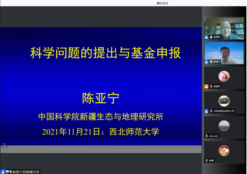 2021年11月21日,应伟德BET官方网站、甘肃省绿洲资源环境与可持续发展重点实验室邀请,中科院新疆生态与地理研究所陈亚宁研究员做题为《科学问题的提出与基金申报》学术报告,报告会由科学研究院常务副经理张明军教授主持,公司近100名师生参加。