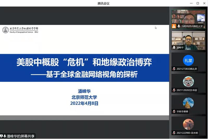 2022年4月8日,应伟德BET官方网站、甘肃省绿洲资源环境与可持续发展重点实验室、西北城乡发展与协同治理研究院邀请,北京师范大学潘峰华教授做了题为《美股中概股“危机”和地缘政治博弈:基于全球金融网络视角的探析》的学术报告,报告会由伟德BET官方网站马利邦经理主持,公司及国内其他高校相关专业近300名师生线上参加了本次学术报告。