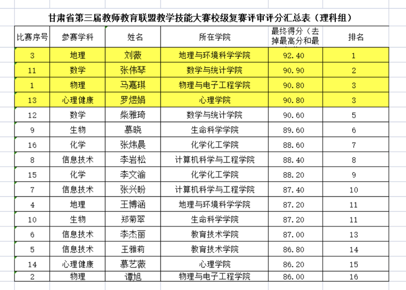 “甘肃高校教师教育联盟师范生教学技能大赛”已举办两届,各届均限定专业参赛。2016届地理科学专业马林彪同学在首届大赛中获地理科学专业一等奖。刘薇同学是第二位地理科学专业代表公司理科组参加此省级教学技能大赛的本科生。
