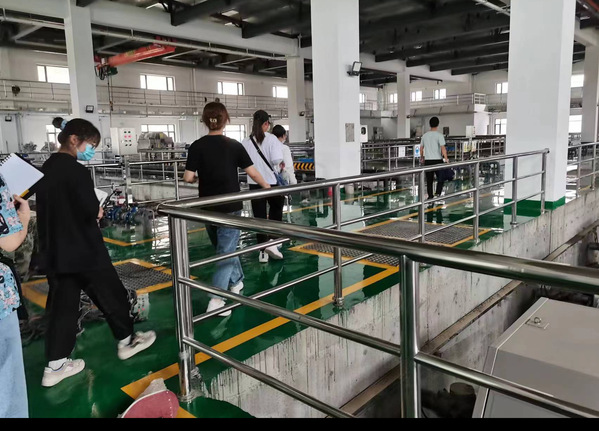 随后污水处理厂环保专工带领大家近距离参观了格栅、泵池、平流沉砂池、配水井等一系列污水处理设备,详细讲解了污水处理厂现行运行工艺,即前期预处理采用A2/O工艺和MBBR工艺结合,后续深度处理工艺为加砂高密池+精密过滤器+次氯酸钠消毒,达到一级A水质标准后排放。通过现场讲解和实地参观学习使同学们深入了解污水的收集、净化以及处理过程。