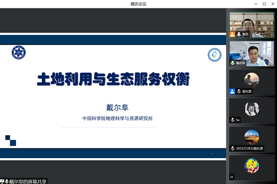 报告开始前,戴尔阜研究员回顾了曾在母校求学的岁月,对母校老师表达了真挚的感谢,随后对自己的学术历程做了简要介绍。报告会围绕土地系统、生态权衡、土地系统与生态权衡三部分进行。第一部分,戴尔阜研究员首先对土地系统、人地关系下的土地系统结构进行了介绍。土地系统本身是地球表面极为复杂的系统,土地系统过程、格局、机制研究是“人-地关系的核心”,随着全球环境变化的不断加剧,使得人地系统研究向集多要素变化的综合研究需求日益增加。随后,戴尔阜研究员将复杂系统理论与土地系统结合,从理论、系统原理、模型特点以及模型的构建与应用等方面对主体模型(Agent based modelling, ABM)进行了详细介绍。第二部分,戴尔阜研究员先是阐述了生态系统服务的研究背景,指出生态系统服务研究已经成为地理学和生态学研究的热点。紧接着,围绕生态系统服务之间的相互作用、权衡量化模型、生态系统服务权衡量化三个方面进行了具体介绍。第三部分,戴尔阜研究员结合土地系统与生态权衡两部分内容,对相关研究的案例进行了重点分析。报告会后,戴尔阜研究员与线上参会的公司及其他高校师生进行了广泛交流,同时,再一次对母校建校120周年表示热烈祝贺。