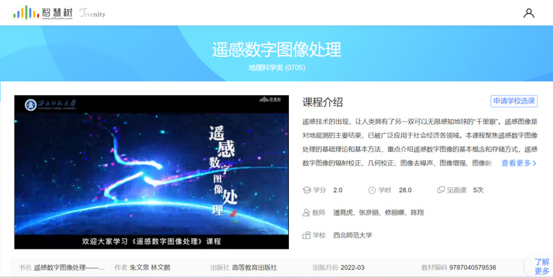 本课程聚焦遥感数字图像处理的基础理论和基本方法,重点介绍遥感数字图像的基本概念和存储方式,遥感数字图像的辐射校正、几何校正、图像去噪声、图像增强、图像融合、图像变换、特征提取、图像分类等内容。课程主要为普通本科院校及高职高专地理、生态、环境、资源、空间信息、农林业、气象等专业教学使用,也可供各专业领域从事相关科学研究和业务应用人员自学使用。