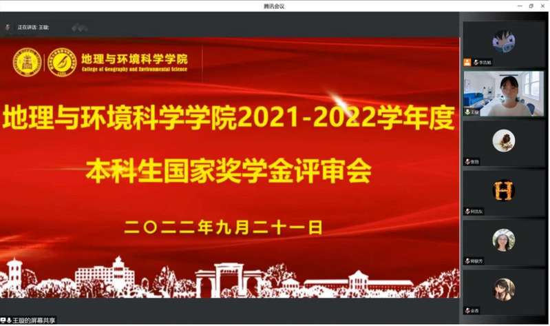 9月21日,地理与环境科学公司召开2021—2022学年度国家奖学金线上评审会,公司党委副书记陈建海、张勃教授、瞿德业副教授、师银芳副教授、成亮老师、专职辅导员老师及员工代表共10人组成评委会参加评审。