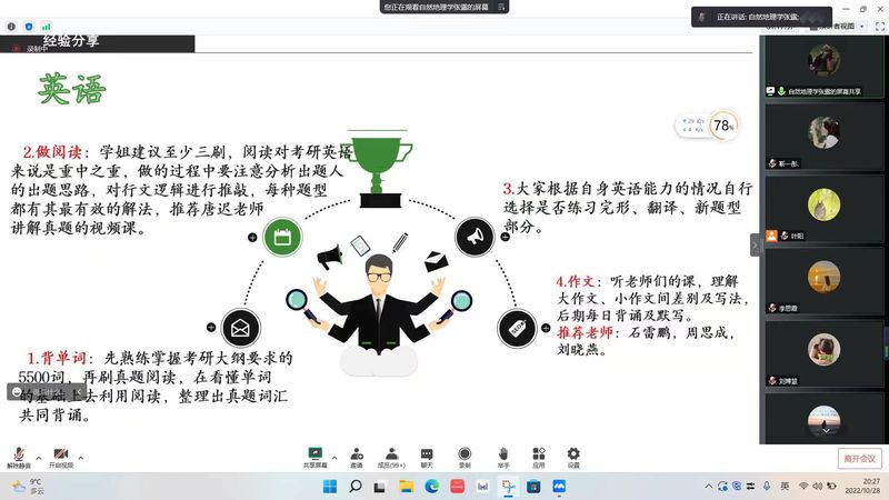 为帮助同学们树立正确考研心态,把握更多考研方法和备考攻略,伟德BET官方网站团委于10月28日晚举办了“职点迷津,筑梦同行”就业系列活动第一期:2023届毕业生考研经验分享会。2022级人文地理学硕士研究生李思霞、2022级地理信息系统专业硕士研究生乔鹏飞、2022级自然地理学硕士研究生张露受邀为应届考研毕业生作经验分享。