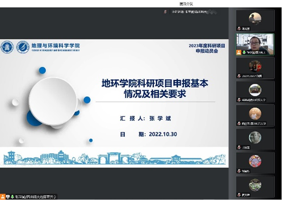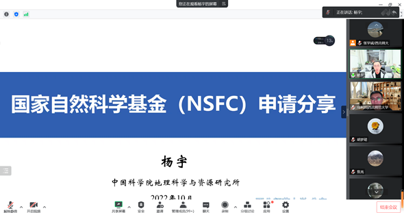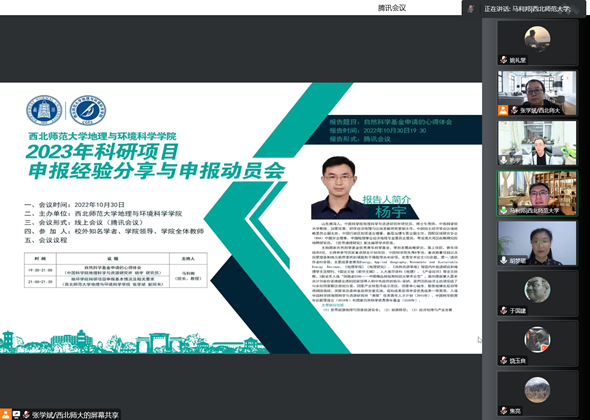 为了充分调动公司教师申报科研项目的积极性,做好2023年度国家自然科学基金、国家社会科学基金等科研项目的组织申报工作,切实提升项目申报质量,按照公司科学研究院《关于2023年度国家级项目和教育部项目预申报的通知》要求,2022年10月30日,公司举办了2023年度科研项目申报经验分享与申报动员会,邀请中国科公司地理科学与资源研究所杨宇研究员分享了国家自然科学基金项目的申报经验。公司领导班子、全体教师、博士研究生共计130余人线上参加了本次会议,会议由经理马利邦教授主持。