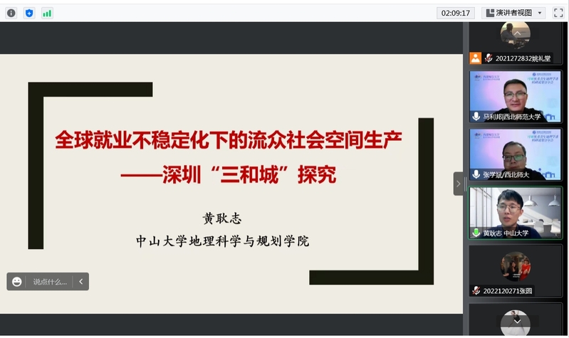 第一场科研成果分享会邀请的是中山大学的黄耿志教授,分享题目为《全球就业不稳定化下的流众空间社会生产——深圳“三和城”探究》。黄耿志教授首先从理论背景方面对相关研究概念发展以及研究意义进行了介绍;接着阐述了世界资本市场化发展阶段、劳动力市场灵活化产生大量不稳定就业、以及就业不稳定化下的社会阶层结构等;最后通过案例区研究指出,流众社会空间是转型期资本与劳动力角逐的矛盾空间,具有不可持续性。会后,黄耿志教授与线上参会师生进行了深入交流。