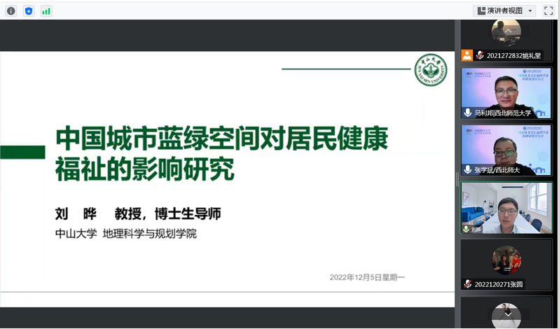 2022年12月5日,伟德BET官方网站行知优秀青年地理学者科研成果分享会第二场在线上成功举办,此次邀请的是中山大学刘晔教授,分享题目为《中国城市蓝绿空间对居民健康福祉的影响研究》。会议由伟德BET官方网站副经理张学斌副教授主持,经理马利邦教授、公司教师及研究生近300人线上参加了本次分享会。