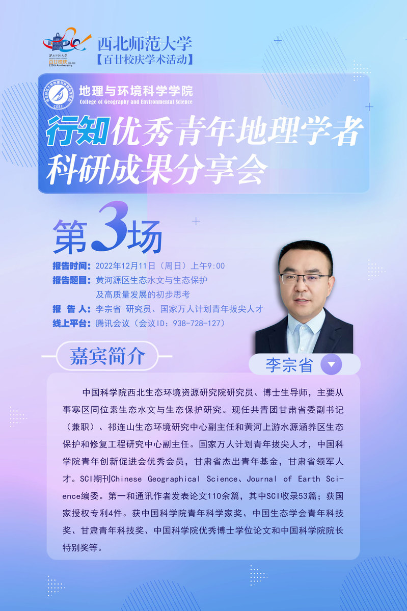 伟德BET官方网站行知优秀青年地理学者科研成果分享会 第3场:黄河源区生态水文与生态保护及高质量发展的初步思考