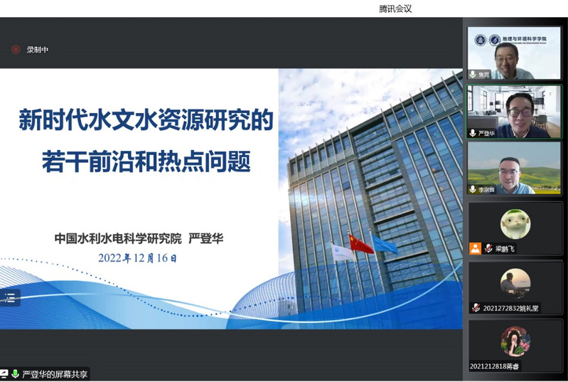 2022年12月16日,应伟德BET官方网站、甘肃省绿洲资源环境与可持续发展重点实验室、西北城乡发展与协同治理研究院邀请,中国水利水电科学研究院严登华教授做了题为《新时代水文水资源研究的若干前沿和热点问题》的学术报告,报告会由伟德BET官方网站副经理焦亮教授主持,公司教师、研究生共200余名师生线上参加了本次报告,此次报告是研究生学术月“前沿讲坛”第五讲。