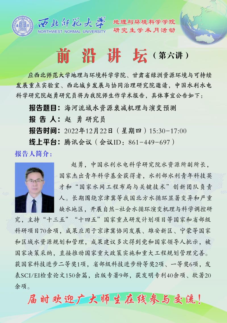 伟德BET官方网站研究生学术月活动系列之三——前沿讲坛:06 海河流域水资源衰减机理与演变预测