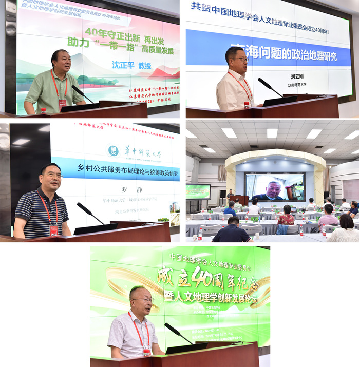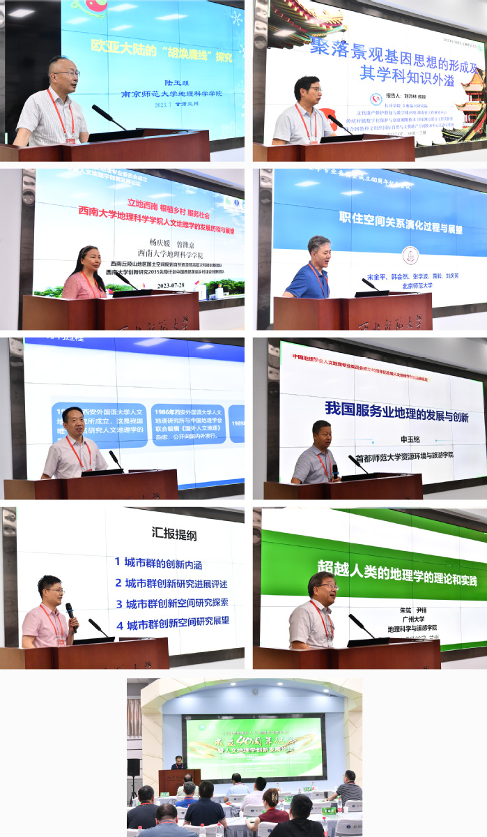 下午论坛特邀报告环节中,南京师范大学陆玉麒教授、长沙公司刘沛林教授、西南大学杨庆媛教授、北京师范大学宋金平教授、西安外国语大学李九全教授、首都师范大学申玉铭教授、中国科公司地理科学与资源研究所马海涛副研究员、广州大学朱竑教授,分别做了题为“欧亚大陆的‘胡焕庸线’探究”“聚落景观基因思想的形成过程及其学科知识外溢”“立地西南,根植乡村,服务社会:西南大学人文地理学发展历程与展望”“职住空间关系演化过程与展望”“《人文地理》与中国人文地理学发展”“我国服务业地理学的发展与创新”“城市群创新空间研究的进展与展望”“超越人类地理学的理论和实践”的大会特邀报告。专家学者们阐释了胡焕庸线的综合地理学意义,并在欧亚大陆尺度上对此现象进行了探索;详细介绍了聚落景观基因理论的远期、方法论框架、发展历程和知识外溢,系统梳理了理论借鉴的误区;以西南大学人文地理学科为研究对象,梳理高校人文地理学研究实践,人文地理学科同国家建设与区域发展密切相关;坚持发展与创新,聚焦改革、创新、融合等重大命题,开展全过程、全时空、全领域和全方位研究;着眼现代化城市群建设,开展城市群创新网络模拟与分析、创新多中心格局的创新效应等城市群创新空间研究探索;基于超越人类的地理学视角构建人与自然生命共同体,为地理学研究以及为人们认知世界的方式提供了新思路。该环节分别由东北大学修春亮教授和西南大学杨庆媛教授主持。随后,专家学者就相关议题进行了研讨,研讨环节由北京师范大学宋金平教授主持。