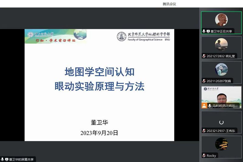 2023年9月20日下午,应伟德BET官方网站、甘肃省绿洲资源环境与可持续发展重点实验室、西北城乡发展与协同治理研究院邀请,北京师范大学董卫华教授做了题为《地图学空间认知眼动实验原理与方法》的学术报告,报告会由伟德BET官方网站经理马利邦教授主持,公司部分教师、研究生线上参加了本次报告。