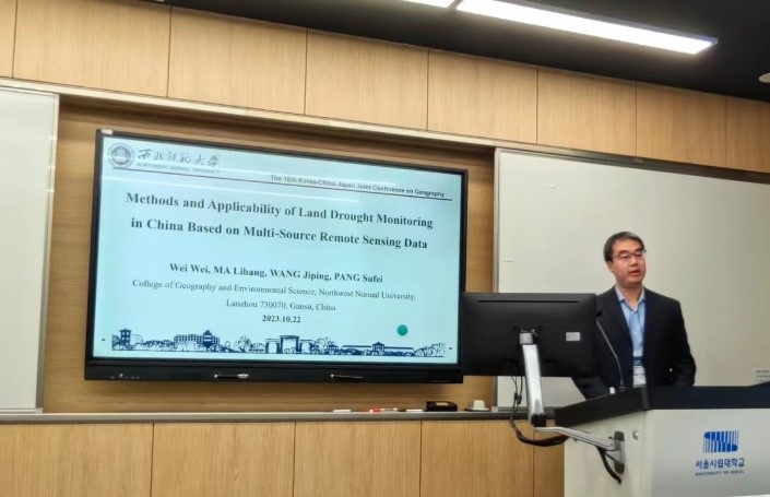 大会主旨报告结束后,魏伟教授在“GIS和遥感应用专题”分论坛上作了题为“Methods and Applicability of Land Drought Monitoring in China Based on Multi-Source Remote Sensing Data”的英文报告,并就自己论文与研究成果与中、日、韩学者进行交流和探讨。