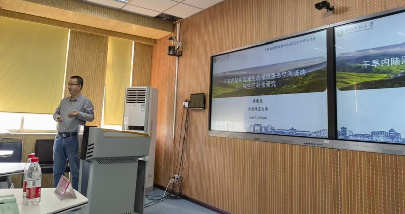 潘竟虎教授在“黄河流域生态文明演进与高质量发展”分会场作了题为“干旱内陆河流域生态系统服务空间流动与生态补偿研究”的学术报告,参会研究生陈田、杨文乐、马力、门丹分别在分会场作了学术报告,就自己的研究成果与专家学者进行了深入交流。潘竟虎教授和张学斌教授分别担任了相关分会场评议人。