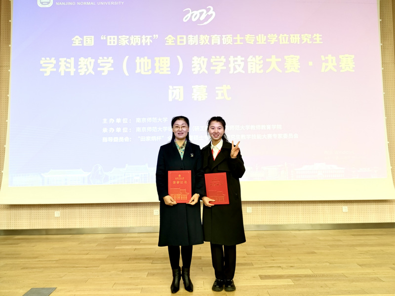 11月17日-19日,2023年全国“田家炳杯”全日制教育硕士专业学位研究生学科教学(地理)教学技能大赛决赛在南京师范大学仙林校区举办。2022级“本硕一体生”刘薇同学荣获2023年全国“田家炳杯”全日制教育硕士专业学位研究生学科教学(地理)教学技能大赛二等奖,胡梦珺副教授获“优秀指导教师”称号。