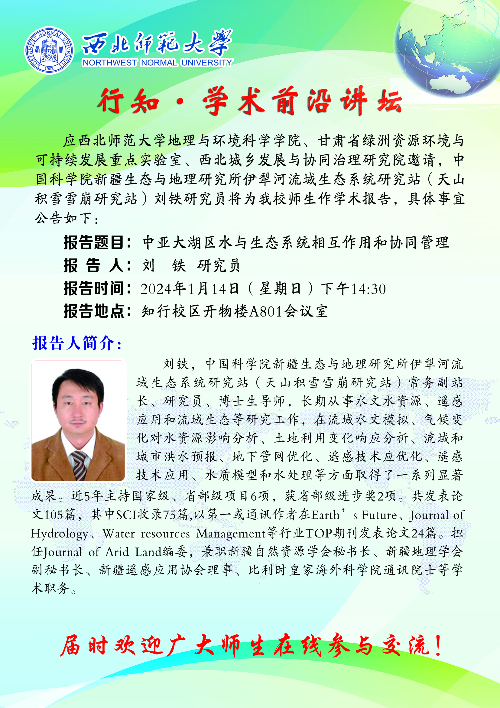 伟德BET官方网站行知•学术前沿讲坛 2024-01期:中亚大湖区水与生态系统相互作用和协同管理