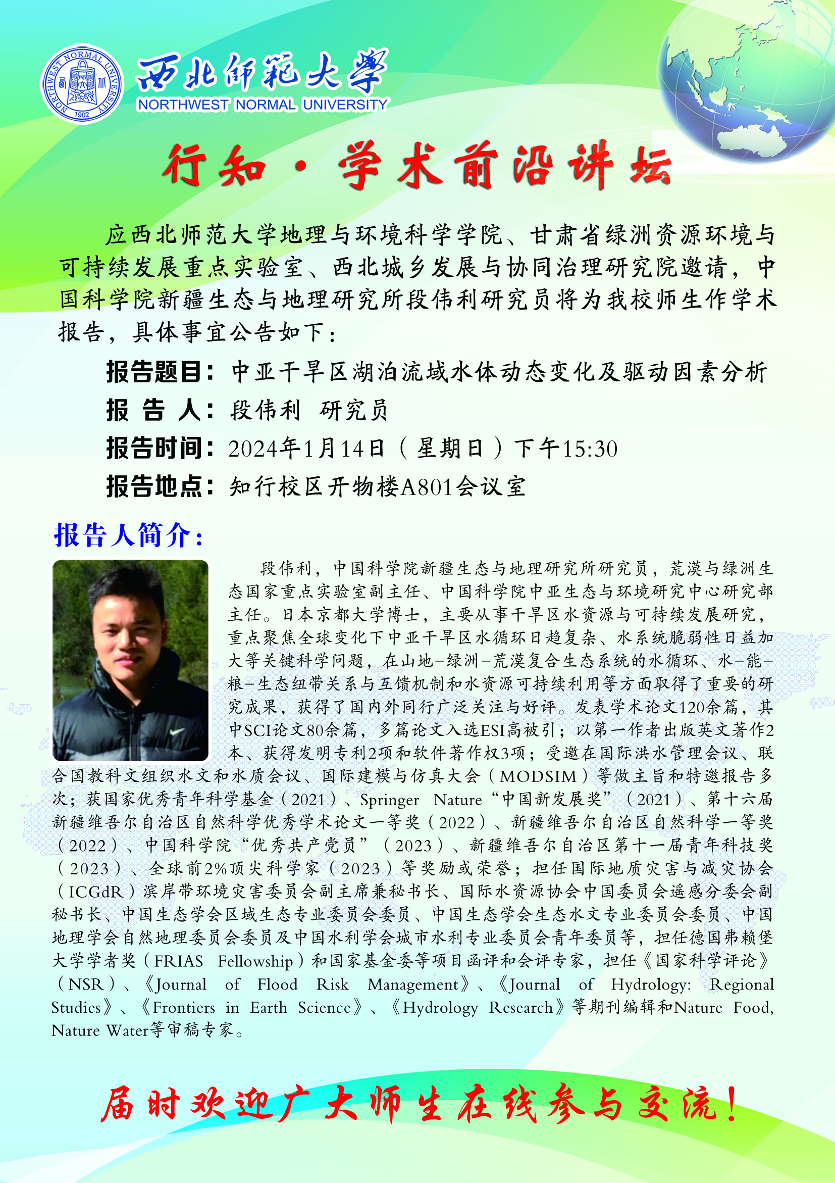 伟德BET官方网站行知•学术前沿讲坛 2024-02期:中亚干旱区湖泊流域水体动态变化及驱动因素分析