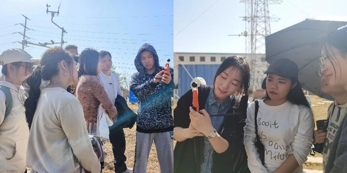 讲解员为同学们讲解手持气象台的结构和使用方法,并让员工亲手体验测量气温、辐射、风速、海拔等气象要素,同学们在活动现场共同探索气象仪器奥秘,关注气象与气候变化,讨论热烈,气氛活跃。