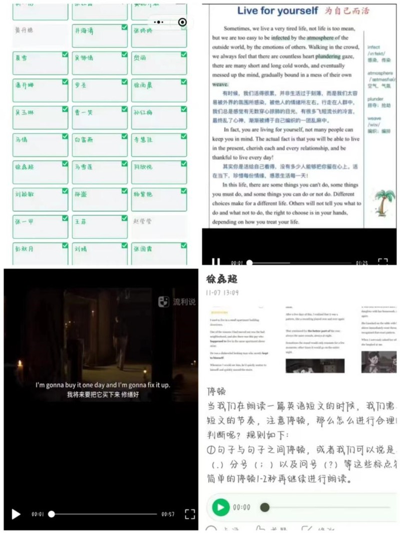 口语提升板块中,员工每日自主选取一段英语美文进行朗读,在打卡群提交一分钟左右的音频或视频进行每日打卡,以此增强朗读能力,提高口语水平。此外,还有英语电影配音等内容,增加了打卡活动的趣味性,提高了该活动的每日打卡率。