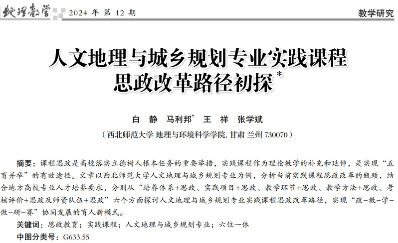 以白静教授为第一作者发表的《人文地理与城乡规划专业实践课程思政改革路径初探》一文以BET伟德官方网站人文地理与城乡规划专业为例,梳理了当前思政改革的瓶颈,结合地方高校人才培养需求,提出了“培养体系+思政、实践项目+思政、教学环节+思政、教学方法+思政、考核评价+思政及团队队伍+思政”的六方面改革路径,以此实现“政-教-学-做-研-赛”的育人新模式。该成果受到2022年甘肃省教学成果培育项目“实践问道、知行合一-地理学科一流人才培养模式探索与实践”与2023年甘肃省公司产品成果培育项目“课程思政背景下师范类院校人文地理与城乡规划专业教学改革探索”项目支持。