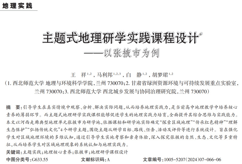 以王祥博士为第一作者的《主题式地理研学实践课程设计-以张掖市为例》的研究从人文地理与城乡规划专业实习实践出发,选择富有甘肃特色的河西走廊典型区域张掖市为研学地,融入主题式教学理念,设置“探索区域地理、传承红色精神、理解生态保护、弘扬传统文化”四大主题,围绕不同主题设定具体的研学路线、研学任务。通过身体力行的研学活动旨在促进员工地理实践力的培养,达到地理实践教育内化于心,外化于行的教学目的。该成果受到2023年甘肃省一流课程“城乡规划社会实践-绿洲城乡融合发展社会实践”与2023年公司教学团队“城乡发展与空间规划”项目支持。