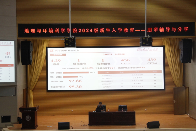 最后,2024年国家奖学金获得者2022级人文地理与城乡规划班冯甘雨同学就“自我认知与定位、持续学习与成长、团队协作与沟通、勇于担当与奉献”四个方面展开朋辈分享,与新生同学分享了自己在专业学习、学科竞赛、员工工作、日常生活等方面的经验和体会,鼓励大家抓住机会,不断探索自我成长的可能性。