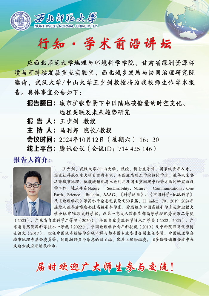 伟德BET官方网站行知•学术前沿讲坛2024-19期:城市扩张背景下中国陆地碳储量的时空变化、远程关联及未来趋势研究