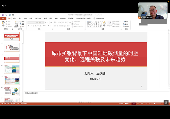 报告会上,王少剑教授深度整合了在《科学通报》与《中国科学:地球科学》这两本高水平学术期刊上发表的研究成果,向与会者精彩呈现了在城市扩张大背景下,中国陆地碳储量的时空演变特征、远程关联性以及未来发展趋势的深刻洞察。
