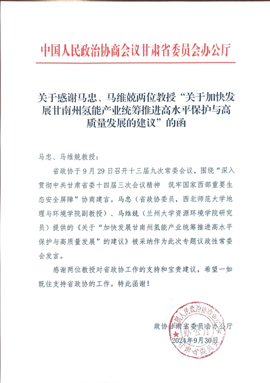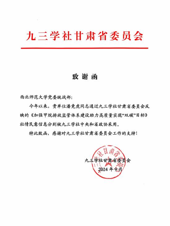 近日,九三学社西北师大基层委员会副主委、公司教授潘竟虎,通过九三学社甘肃省委会反映的“加强甲烷排放监管体系建设 助力高质量实现“双碳”目标”社情民意信息,被九三学社中央和省政协采用。民进西北师大支部主委、伟德BET官方网站副教授马忠提供的“关于‘加快发展甘南州氢能产业统筹推进高水平保护与高质量发展’的建议”,被省政协十三届九次常委会议采纳并列为专题议政性常委会发言。