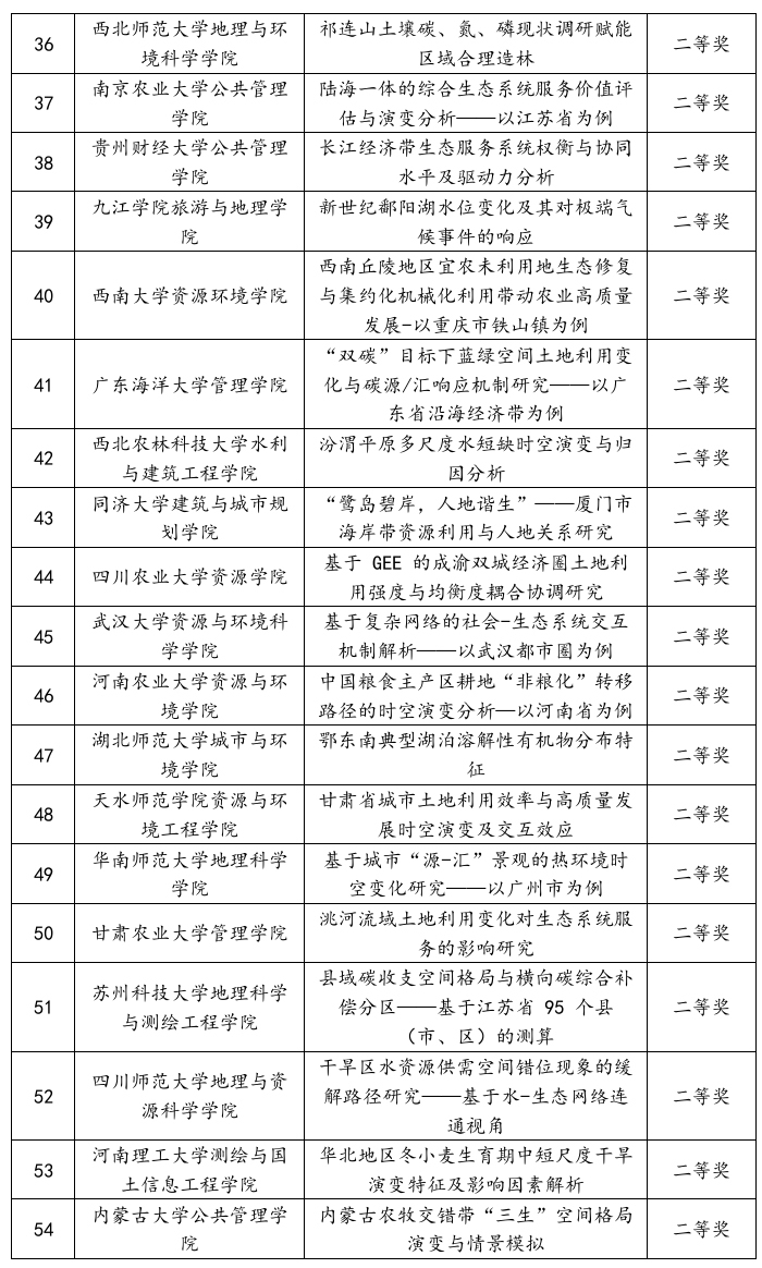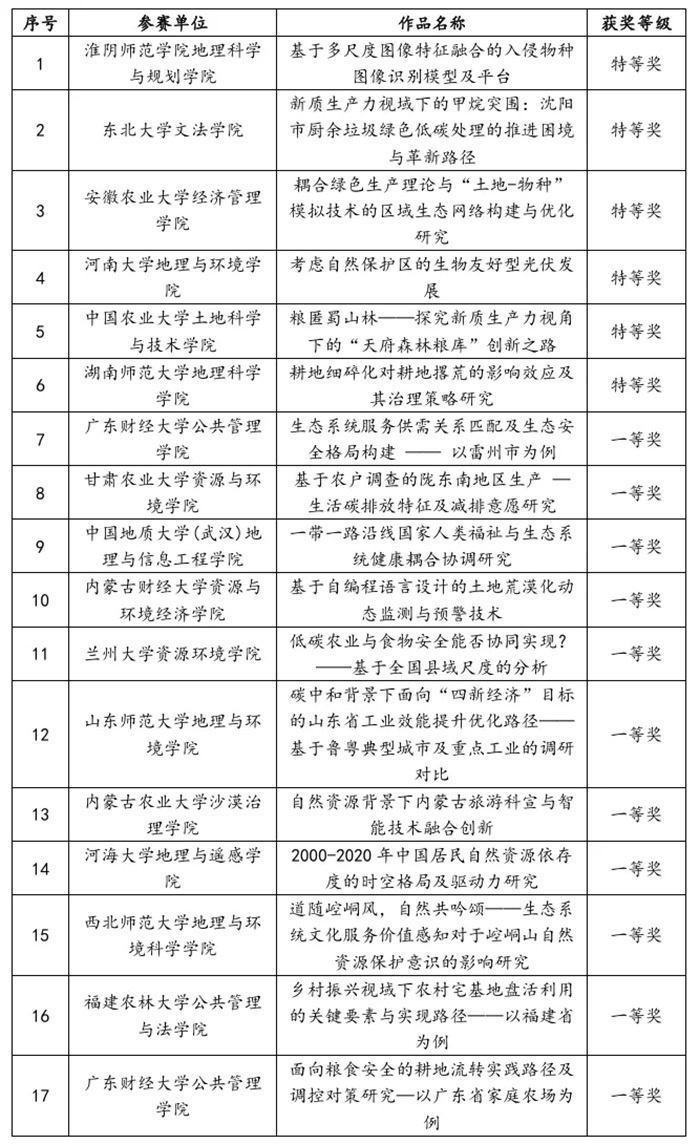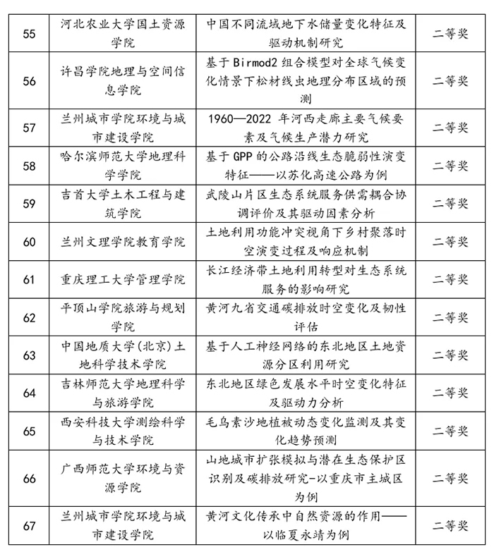 本届大赛决赛分为4组进行,共有67支队伍参与比赛。参赛作品紧扣主题,涉及资源科学的方方面面。从资源调查与评价、资源利用与规划,到自然资源综合管理;从理论建构、方法应用、技术创新到政策评价;从野外实验、田野调查到空间解析、模拟预测。研究方法新颖,数据来源多样,体现了青年学子们在新时代背景下对自然资源保护利用的思考。