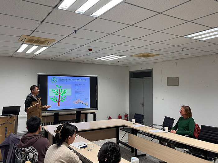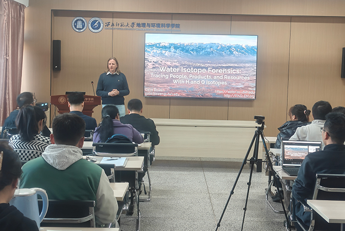 来访期间,Gabriel J. Bowen教授与公司师生分享了水同位素方面的研究进展,作了题为《Water isotope forensics: Tracing people, products, and resources with H and O isotopes》的学术报告,报告系统介绍了水体同位素景观图谱的构建,结合实例分析了氢氧稳定同位素的示踪应用情况,交流活动由甘肃省绿洲资源环境与可持续发展重点实验室副主任王圣杰主持。