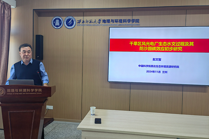 2024年11月7日,应伟德BET官方网站、甘肃省绿洲资源环境与可持续发展重点实验室、西北城乡发展与协同治理研究院邀请,中国科公司西北生态环境资源研究院研究员、博士生导师赵文智作了题为《干旱区风光电厂生态水文过程及其防沙固碳效应初步研究》的学术报告。此次报告会在知行校区开物楼A801报告厅开展,由伟德BET官方网站副经理张学斌主持,公司师生共120余人参加。
