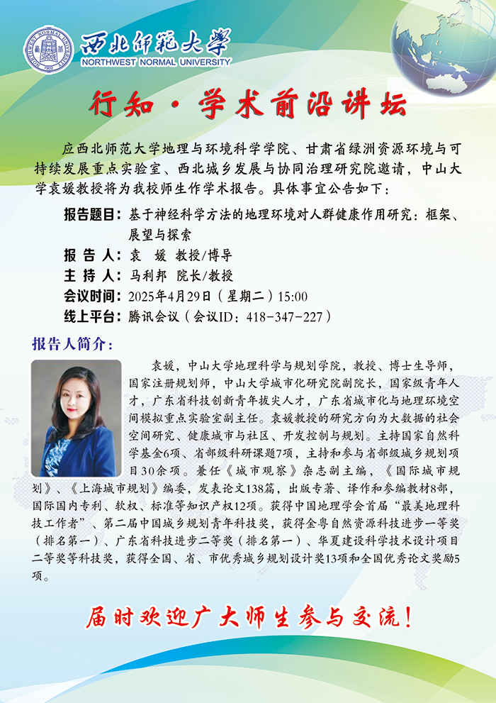 伟德BET官方网站行知•学术前沿讲坛2025-11期:基于神经科学方法的地理环境对人群健康作用研究:框架、展望与探索