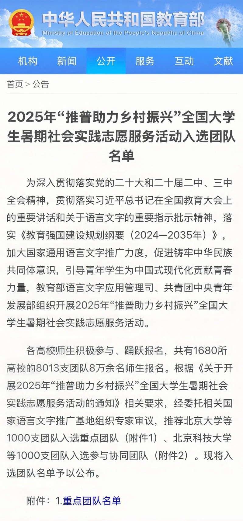 喜报|伟德BET官方网站推普实践团再次成功入选2025年“推普助力乡村振兴”全国老员工暑期社会实践志愿服务活动重点团队