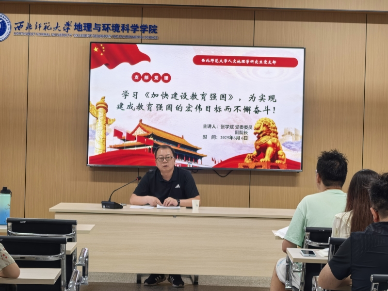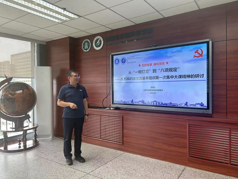 6月25日下午,党委书记于国建给地理科学系本科生第三党支部讲党课,与员工共同学习中央八项规定精神,6月26日上午,于国建给院办教职工党支部作了题为《八项规定改变中国》的专题党课;6月27日,经理、党委副书记马利邦为城市与资源学系教工党支部作了《从“一根灯芯”到“八项规定”——关于2025年党员基本培训第一次集中大课精神的研讨》的党课;2025年6月26日,党委副书记谢文涛为本科生第二党支部作了题为《筑牢中华民族共同体意识专题学习》的党课;副经理姚晓军、张学斌、胡梦珺等也分别于近期为地理信息学系教工党支部、人文地理学研究生党支部及地理科学系教工党支部讲了党课。